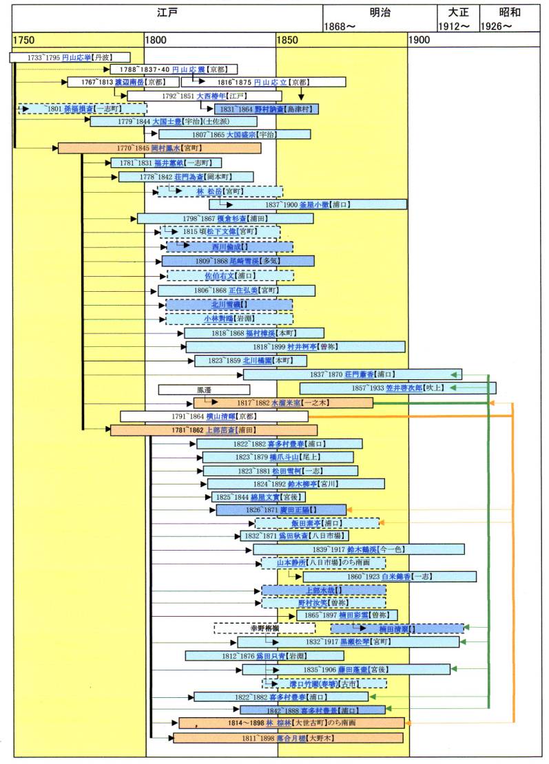 【享生没年】63歳1733~1795享保18〜寛政7【生地】丹波(京都)【住地】【系譜】 【略歴】生家は丹波桑田郡(京都府)の農家。 【書画暦】四条・円山派。円山派の創始者。狩野(かのう)派の石田幽汀(ゆうてい)に学ぶ。遠近法などをとりいれて独自の写生画を創出した。代表作に「雪松図」(国宝)、「七難七福図巻」、大乗寺の障壁画 |